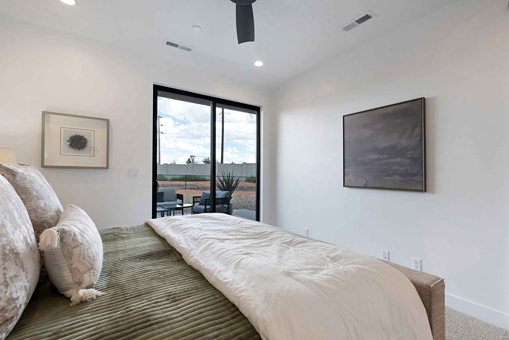 Each of the 3 bedrooms features a plush top of the line mattress ensuring a restful nights sleep. The primary suite is located on the main level and has a King sized bed and large sliding doors that lead you right out onto the back patio where you can relax while you enjoy a cup of coffee in the morning and watch the red hills light up under the rising sun, or relax in the evening as you view the magnificent sunsets and unobstructed starry skies of Kanab! This room offers a flat screen Smart TV and bedside tables, as well as a large walk in closet for clothes storage. The ensuite bathroom in the primary bedroom features a walk in luxury shower with a built-in shower bench, and a double vanity.