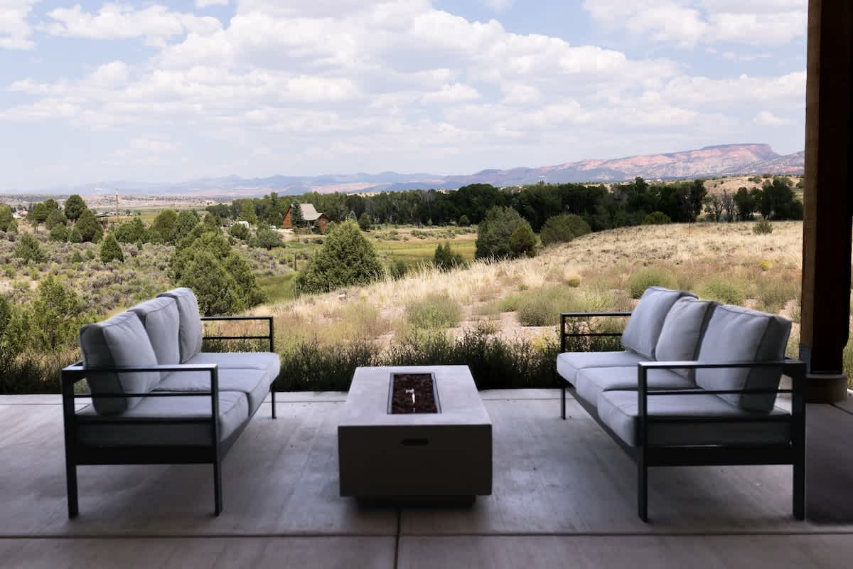 overed patio with dining table, BBQ grill, propane firepit, and hot tub overlooking dramatic landscapes — ideal for sunset dinners and night skies.