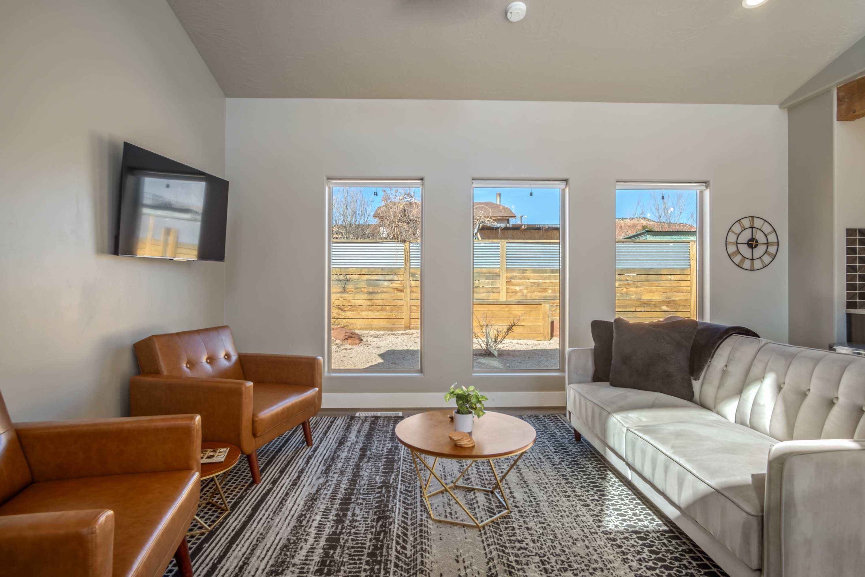 Effortless southern Utah exploration awaits! Located in the heart of Kanab, Timber + Tin G is your ideal home away from home, providing everything you need for a seamless stay. This well-appointed retreat was designed specifically for travelers. It features two inviting bedrooms with deluxe king-size beds, complemented by a convertible sofa bed in the living room, perfect for a maximum of six guests. There are two full bathrooms, as well.
