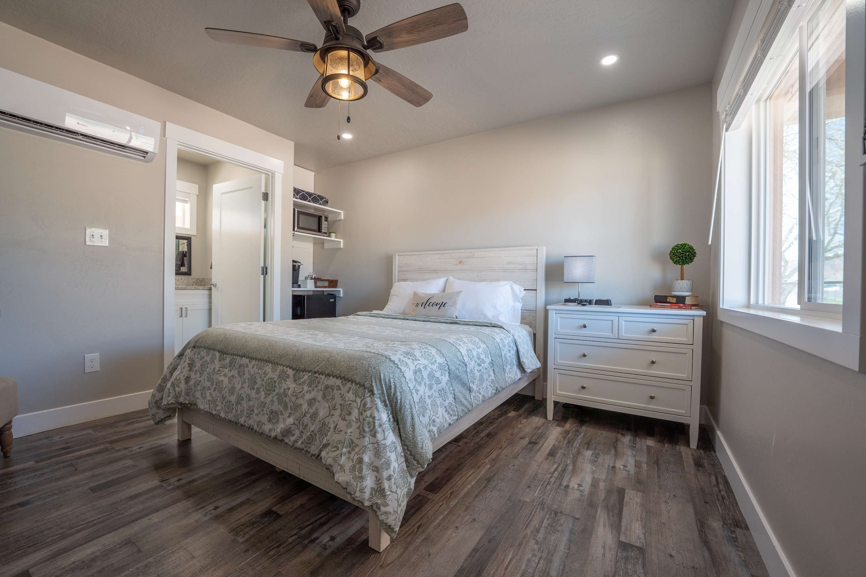 Enjoy stunning sunsets from your covered porch after a day of hiking or sightseeing. Each suite features a private heating and cooling system (no shared air) and coded self-check-in for complete independence and peace of mind. Whether you're here for adventure, solitude, or remote work, this modern studio is designed for comfort and convenience.